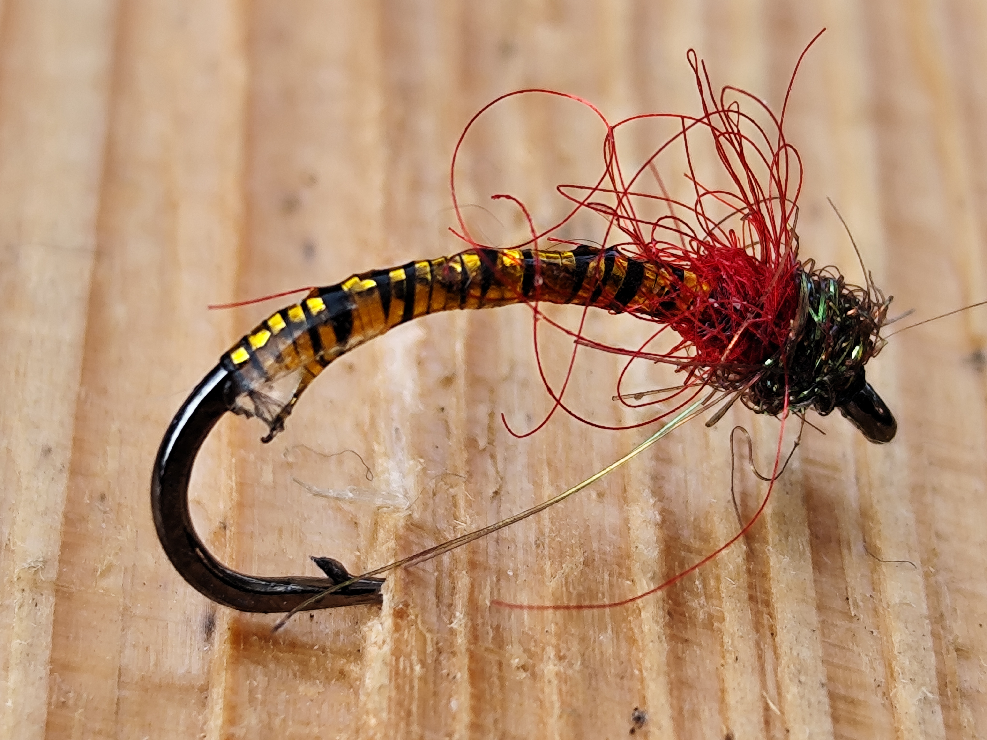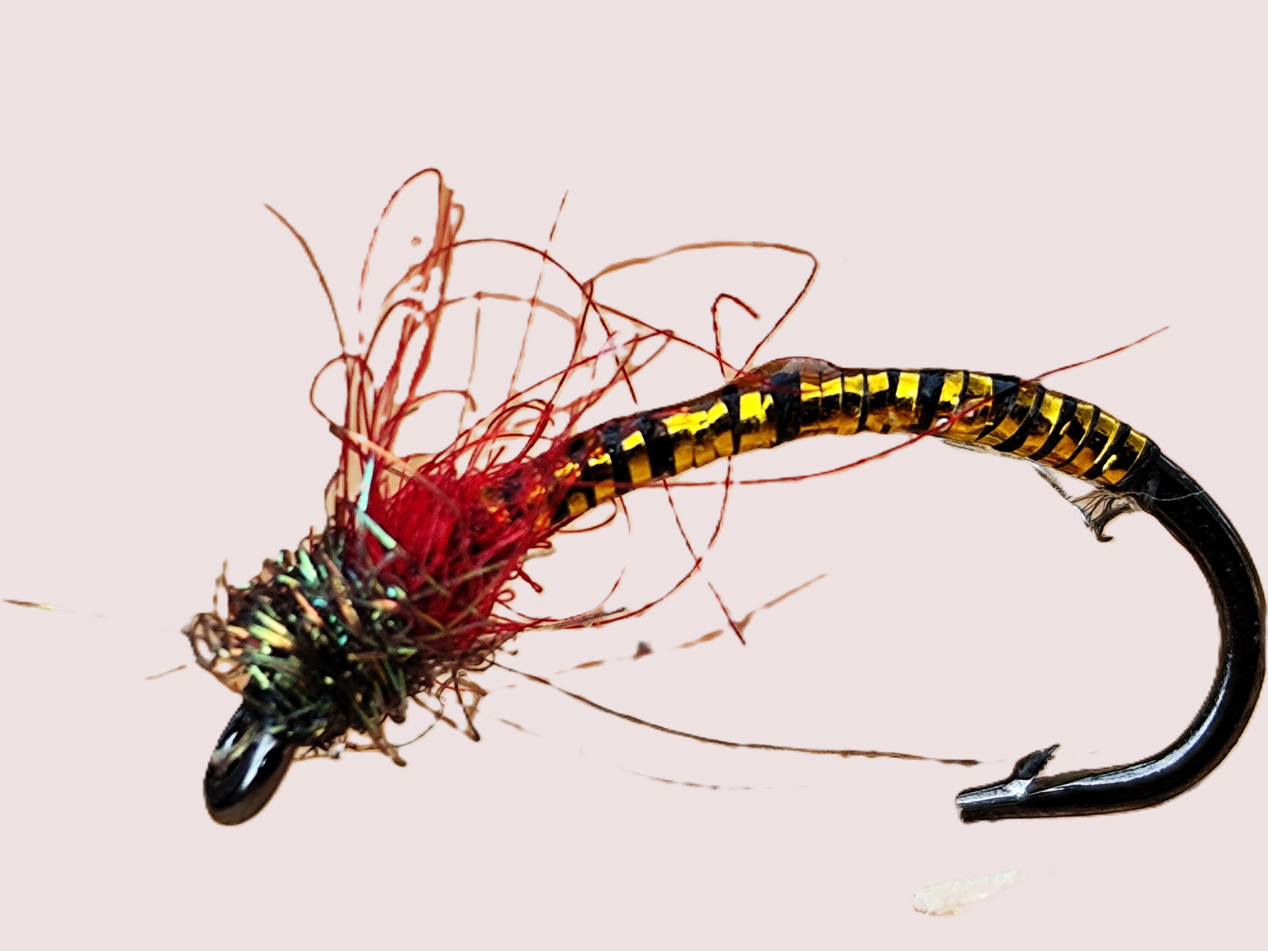 Ano 26% Ne 25% Jsem pro 24 hodinový rybolov 24% Je mi to jedno. 25%Něco ze šuplíku po jednom byvalém kolegovi. Přelakované tělíčko omotané černou nití se zlatou lametkou a napodobením žaber s červeným dubbingem a malou hlavičkou s dubbingem Hends.